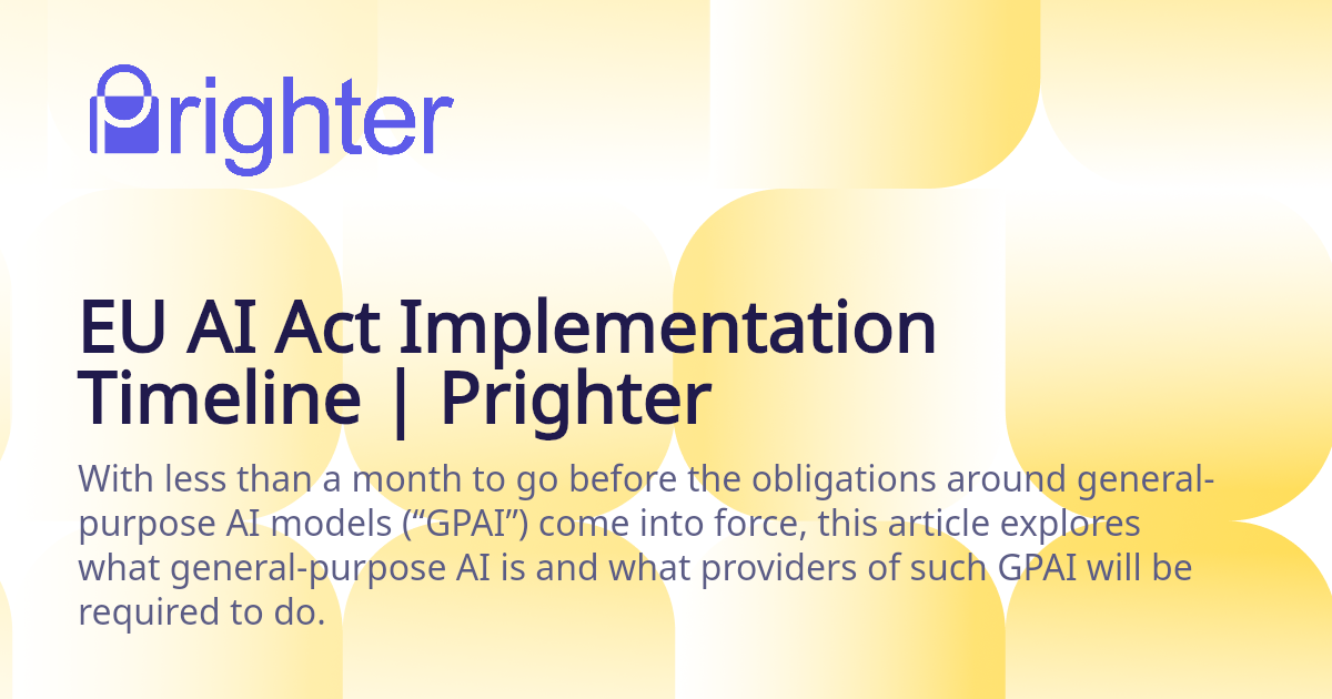 Category background for The EU AI Act Countdown is (Back) on for General-Purpose AI Model Providers. # The EU AI Act Countdown is (Back) on for General-Purpose AI Model Providers. With less than a month to go before the obligations around general-purpose AI models (“GPAI”) come into force, we look here at what general-purpose AI is and what providers of such GPAI will be required to do. ## Obligations on GPAI providers under the EU AI Act. Chapter V of the EU AI Act sets out specific obligations for providers of GPAI models including:. Providers of high-risk GPAI models that do not ha…