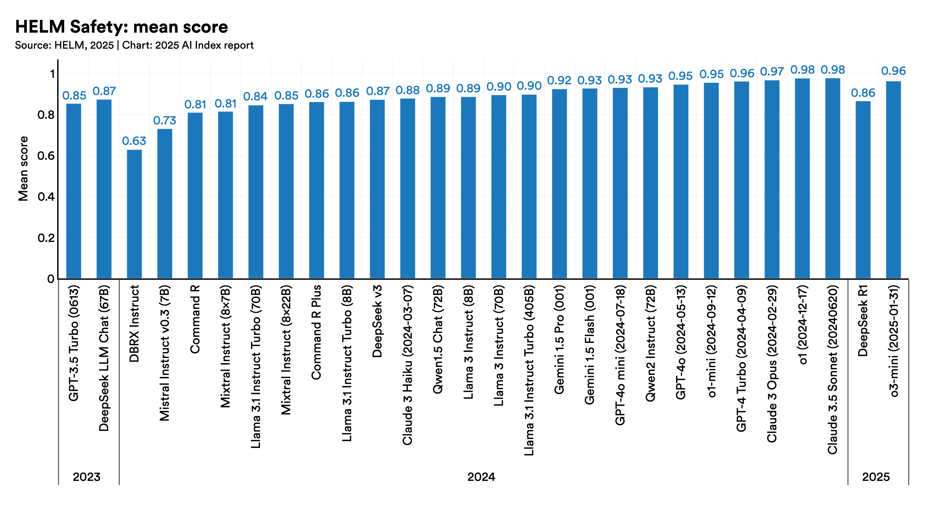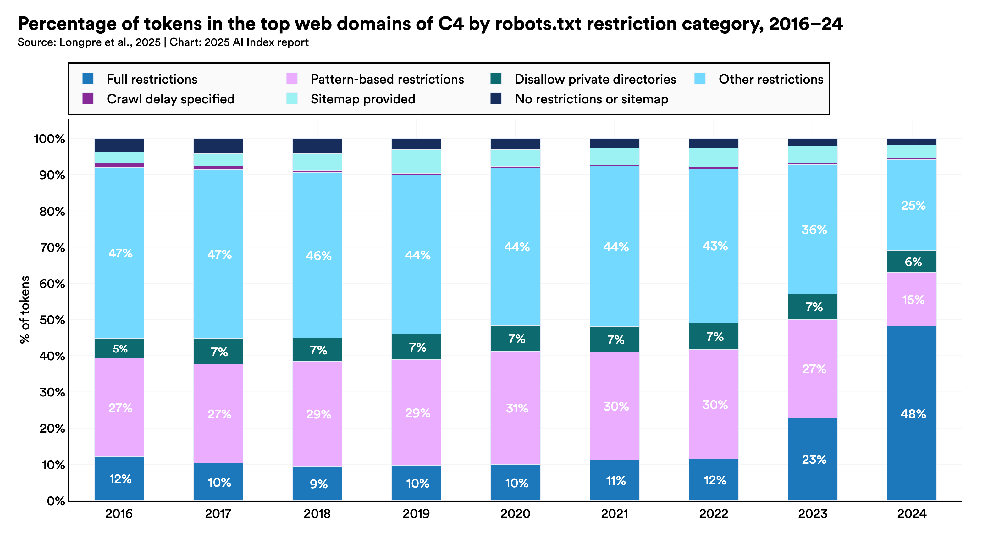 Evaluating AI systems with responsible AI criteria is still uncommon, but new benchmarks are beginning to emerge. Last year’s AI Index highlighted the lack of standardized RAI benchmarks for LLMs. While this issue persists, new benchmarks such as HELM Safety and AIR-Bench help to fill this gap. A recent study found that data use restrictions increased significantly from 2023 to 2024, as many websites implemented new protocols to curb data-scraping for AI training. Earlier benchmarks like HaluEval and TruthfulQA, aimed at evaluating the factuality and truthfulness of AI models, have failed to…