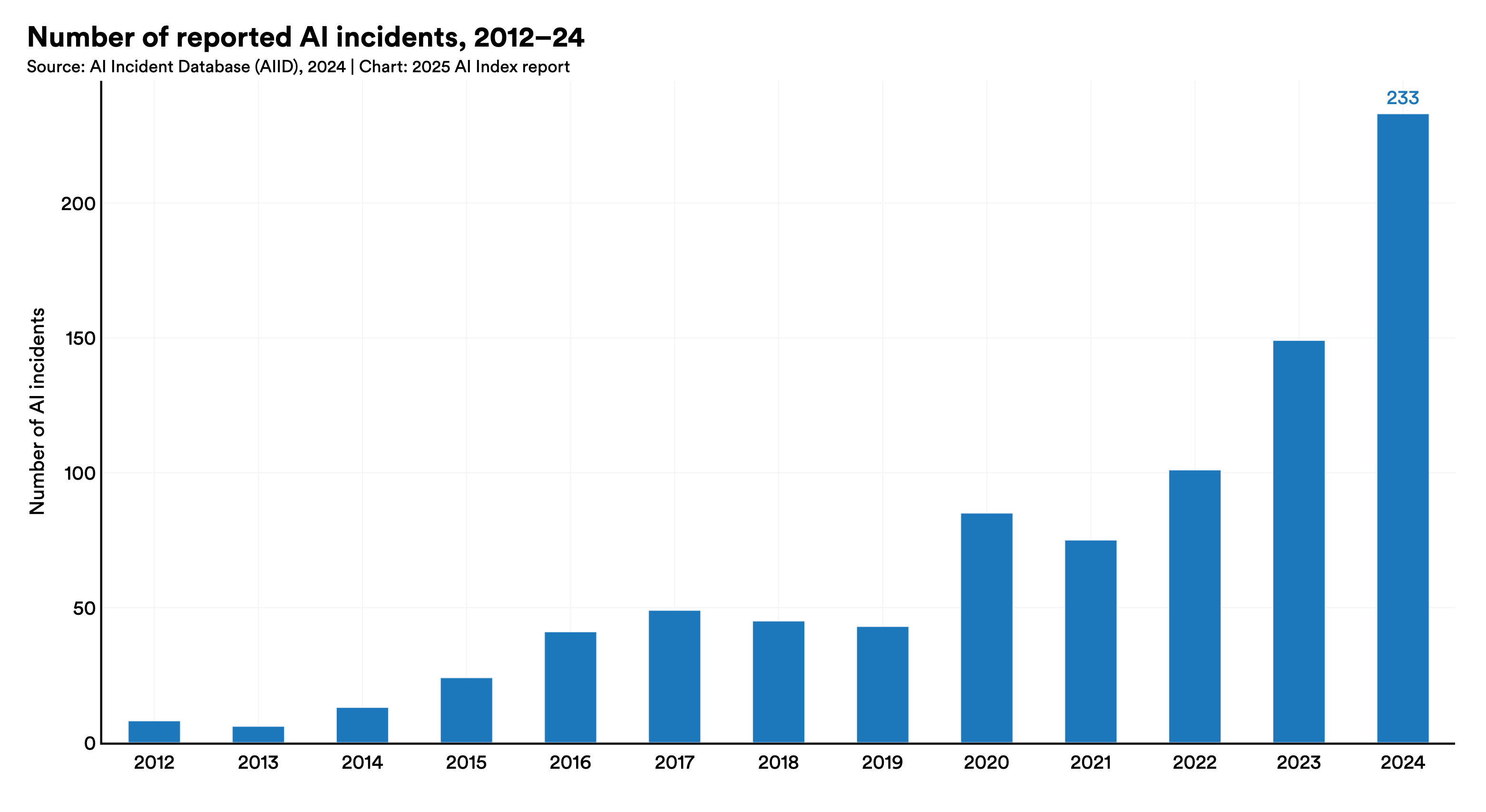 Laut AI Incidents Database stieg die Zahl gemeldeter KI-bezogener Vorfälle 2024 auf 233, ein Plus von 56,4 % gegenüber 2023. Das misst nicht direkt die Fehlerquote von Chatbots, zeigt aber, dass Zuverlässigkeit und Aufsicht praktisch weiter ein großes Thema sind.[