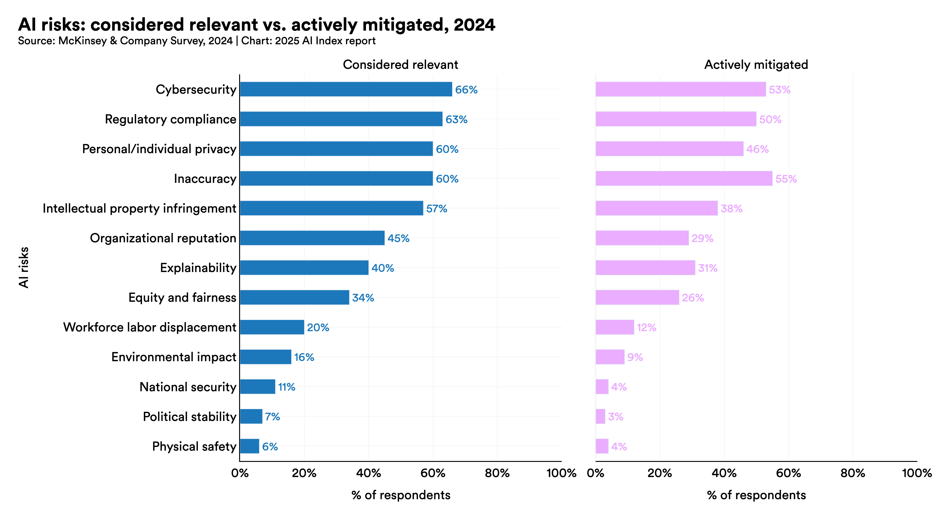 Stanford berichtet außerdem, dass „Ungenauigkeit“ zu den wichtigsten Responsible-AI-Risiken in Unternehmen zählt; 64 % der befragten Führungskräfte nannten sie als Sorge.[