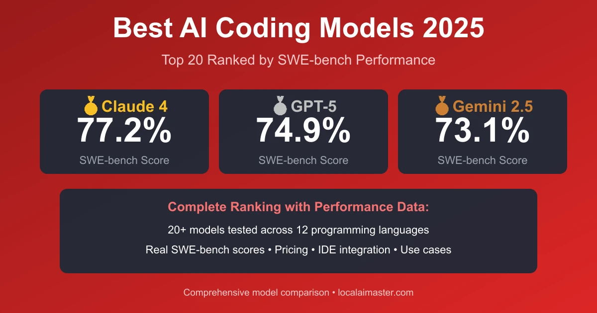 Best AI Coding Models 2026: SWE-Bench Leaderboard (Claude, GPT-5, Gemini). # Best AI Coding Models 2026: SWE-Bench Leaderboard (Claude, GPT-5, Gemini). ## Complete 2026 Rankings: Top 20 AI Coding Models. Based on comprehensive testing using SWE-bench Verified (the industry-standard benchmark for real-world coding tasks), performance analysis across 12 programming languages, and evaluation of 500+ production deployments. | Rank | Model | SWE-bench | Provider | Price/Month | Context | Best For |. ### Cloud Models (Claude 4, GPT-5, Gemini 2.5). **From Local Models to Cloud (Claude/GPT-5):*…