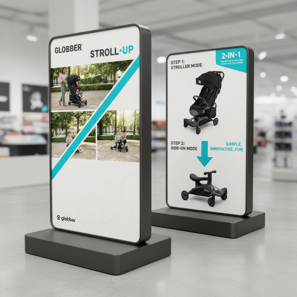 Redesign this existing Globber POS format (shared in the files POS front and POS back attached) to make the stroller-to-ride-on transformation more innovative and immediately understandable. You can use the lifestyle images attached (stroller and rider). Keep the overall structure of a vertical back panel with a rectangular base platform. Improve the front by simplifying the composition, enlarging the imagery with lifestyle imagery (not just kids in products on a white background), and making the transformation the main visual story. Keep the lower half of the front panel clean apart from perhaps a light design element because the physical product totally blocks that area. The style should feel clean, premium, modern, and bold, with strong retail visibility from a distance. On the back panel, show a simple and elegant 2-step transformation sequence with minimal copy and clear benefit communication. Create an image that shows both the front and rear panels