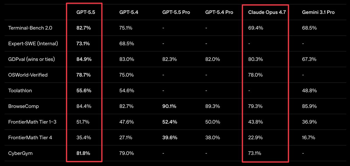 Thanks for signing up! SWE-Bench Pro: GPT-5.5 scored 58.6; Opus 4.7 scored 64.3 percent Terminal-Bench 2.0: GPT-5.5 scored 82.7 percent; Opus 4.7 scored 69.4 percent Humanity's Last Exam: GPT-5.5 scored 40.6 percent; Opus 4.7 scored 31.2 percent\ Humanity's Last Exam (with tools): GPT-5.5 scored 52.2 percent; Opus 4.7 scored 54.7 percent BrowseComp: GPT-5.5 scored 84.4 percent; Opus 4.7 scored 79.3 percent GPQA Diamond: GPT-5.5 scored 93.6 percent; Opus 4.7 scored 94.2 percent ARC-AGI-1 (Verified): GPT-5.5 (High) scored 94.5 percent; Claude 4.7 (High) scored 92 percent\ ARC-AGI-2 (Verified):…