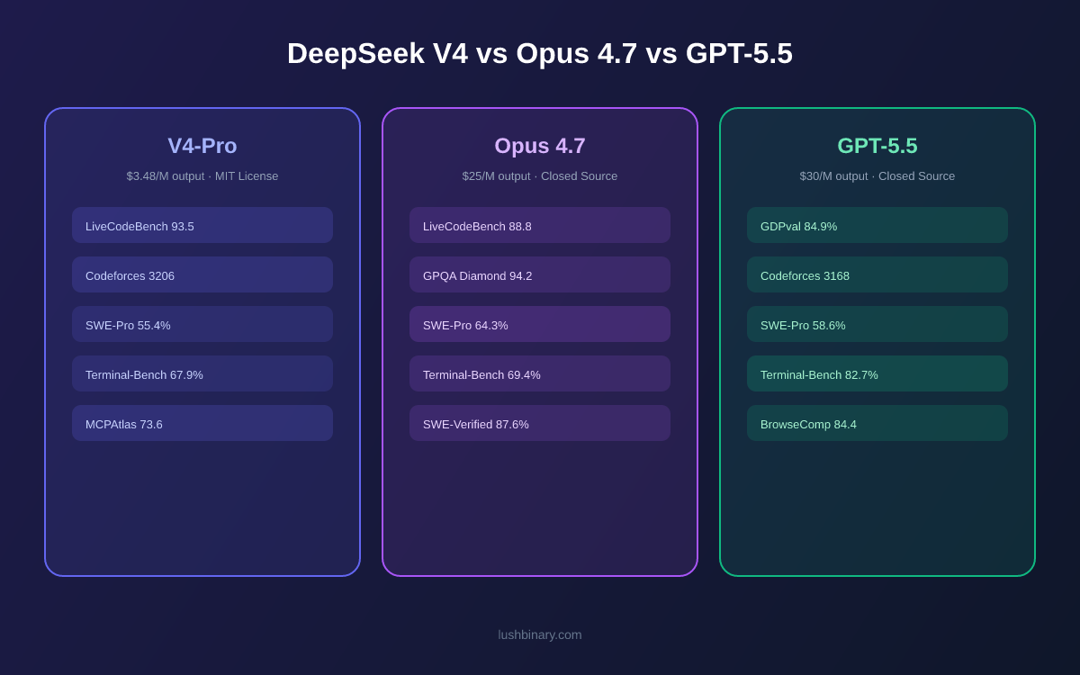 - [3] DeepSeek V4 vs Claude Opus 4.7 vs GPT-5.5: Benchmarks & Pricinglushbinary.com