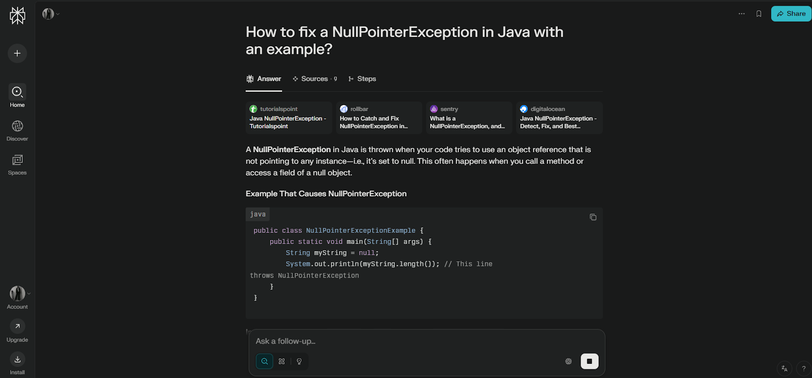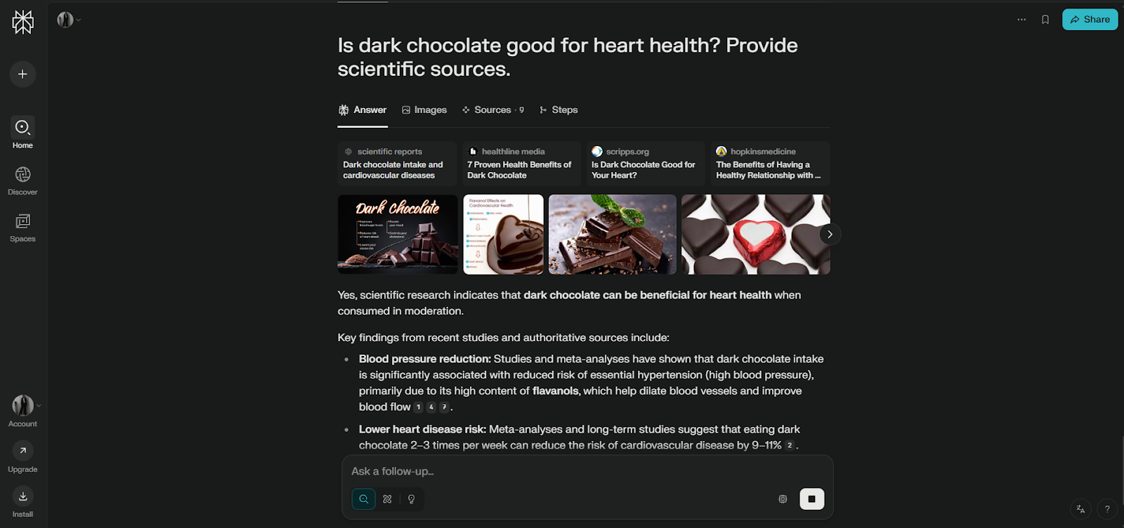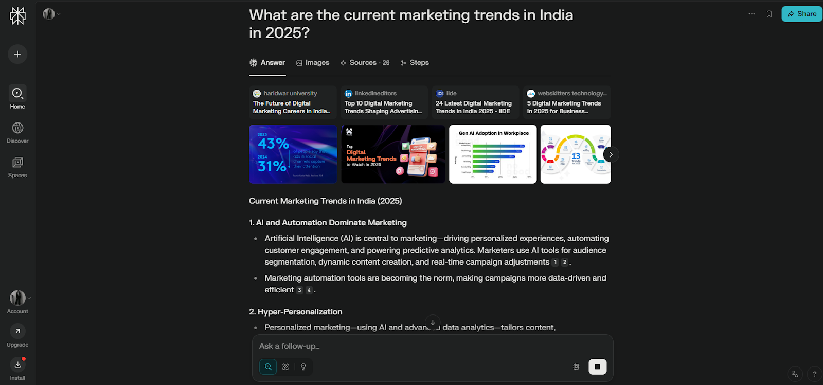 Features: · Perplexity Pro Search: Guided AI search for deeper exploration. · Thread Follow-Up: Keep the conversation going for a deeper