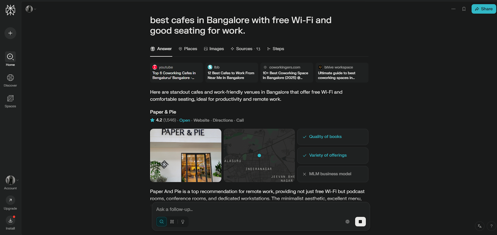 What is Perplexity AI: Key Features, Working and Use Cases. Perplexity AI is not just another search engine. For instance, you can just type in any question like What caused the 2008 financial crisis or Best cafes in Bangalore with Wi-Fi. Perplexity AI responds instantly with a clear answer and clickable citations. It features a dedicated workspace and integrates the Perplexity Assistant on every new tab, allowing you to summarize a webpage, ask follow-up questions about a document, or even use the Shopping Hub to get AI-generated, cited product comparisons right in the browser. ## How Does…