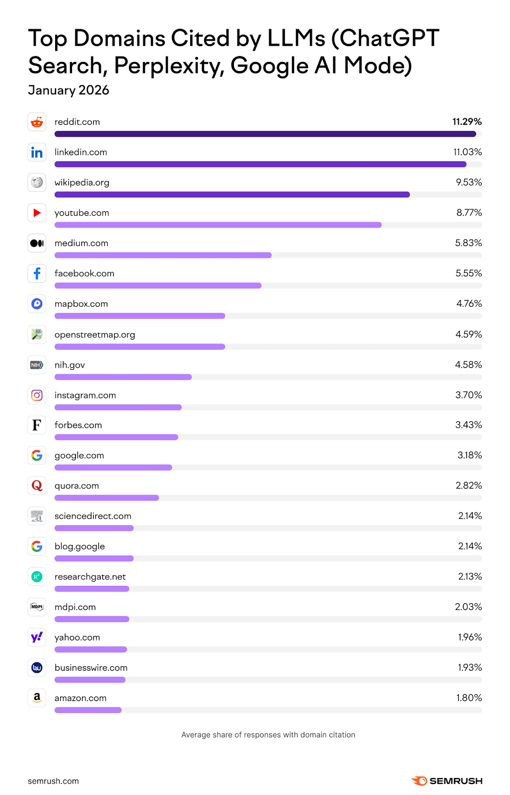 - Semrush 的研究指出,Reddit 和 LinkedIn 都在 ChatGPT、Google AI Mode、Perplexity 的前五大被引用網域之列;同一研究也指出,到了 2025 年 10 月,Reddit 和 Wikipedia 仍是 ChatGPT 最常見的被引用來源之一。