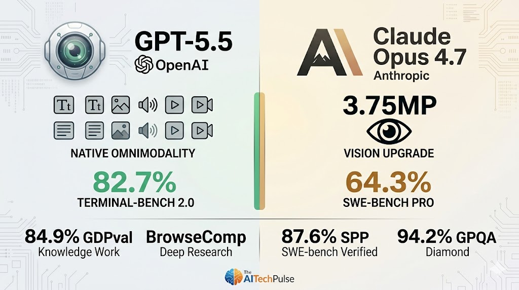 | Benchmark | GPT-5.5 | Opus 4.7 | Gemini 3.1 Pro | --- --- | | SWE-bench Pro | 58.6% | 64.3% | 54.2% | | SWE-bench Verified | ~85% | 87.6% | ~80% | | Terminal-Bench 2.0 | 82.7% | ~72% | ~68% | | GDPval (Knowledge Work) | 84.9% | ~78% | ~75% | | OSWorld-Verified (Computer Use) | 78.7% | ~65% | ~60% | | GPQA Diamond | ~93% | 94.2% | ~91% | | CursorBench | ~65% | 70% | ~58% | | Tau2-bench Telecom | 98.0% | ~90% | ~85% | Key Takeaway Opus 4.7 wins the coding benchmarks (SWE-bench Pro, SWE-bench Verified, CursorBench, GPQA Diamond). GPT-5.5 wins the agentic and knowledge-work benchmarks (Terminal…
